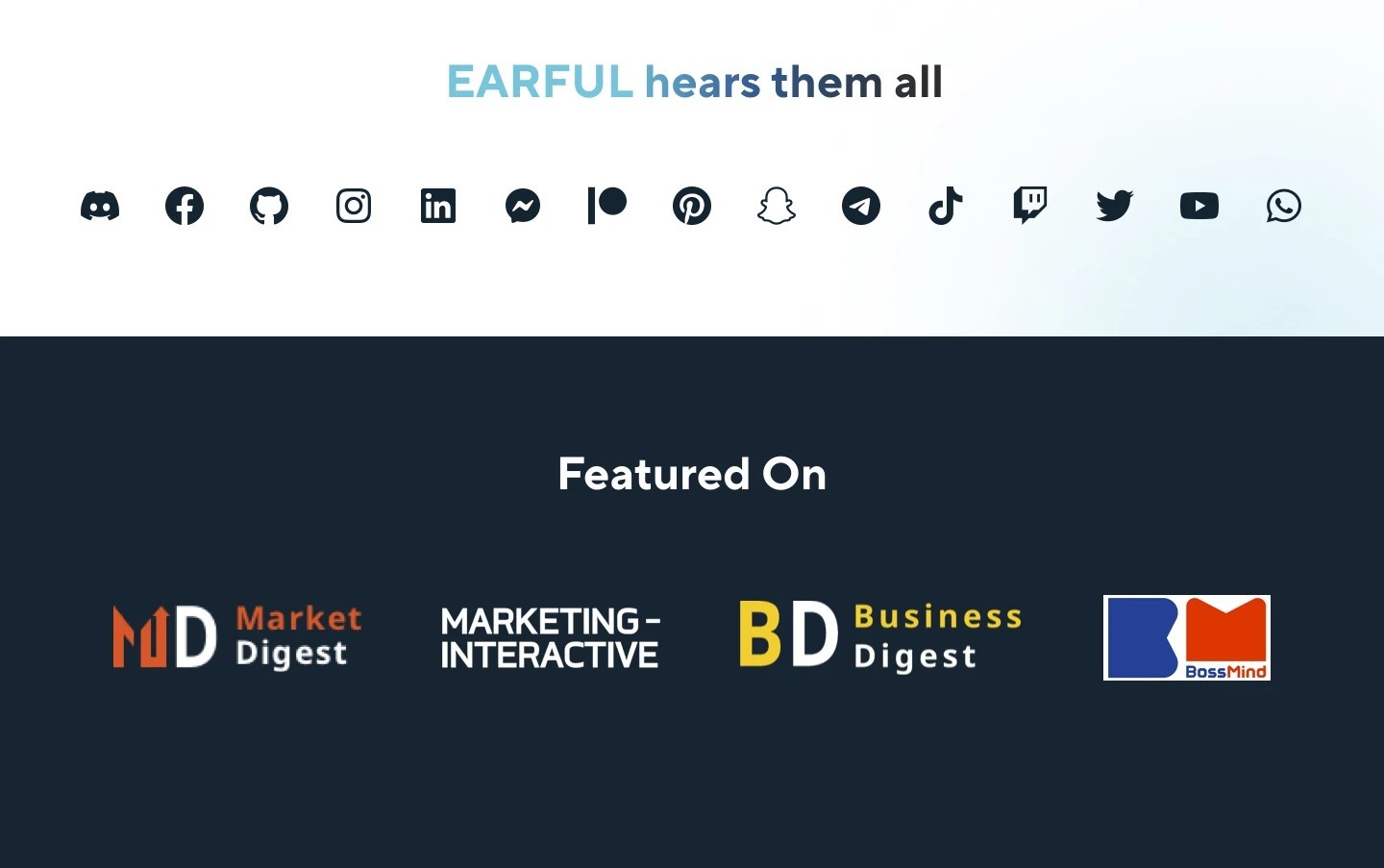 Brand guideline providing complete visual system for consistency with flexibility. One-page website design explains what Earful does, demonstrates value, builds credibility, and converts visitors through scrolling narrative guiding through problem, solution, features, and calls-to-action. Social media strategy and templates maintain active, engaging presence educating customers while positioning Earful as thought leaders.