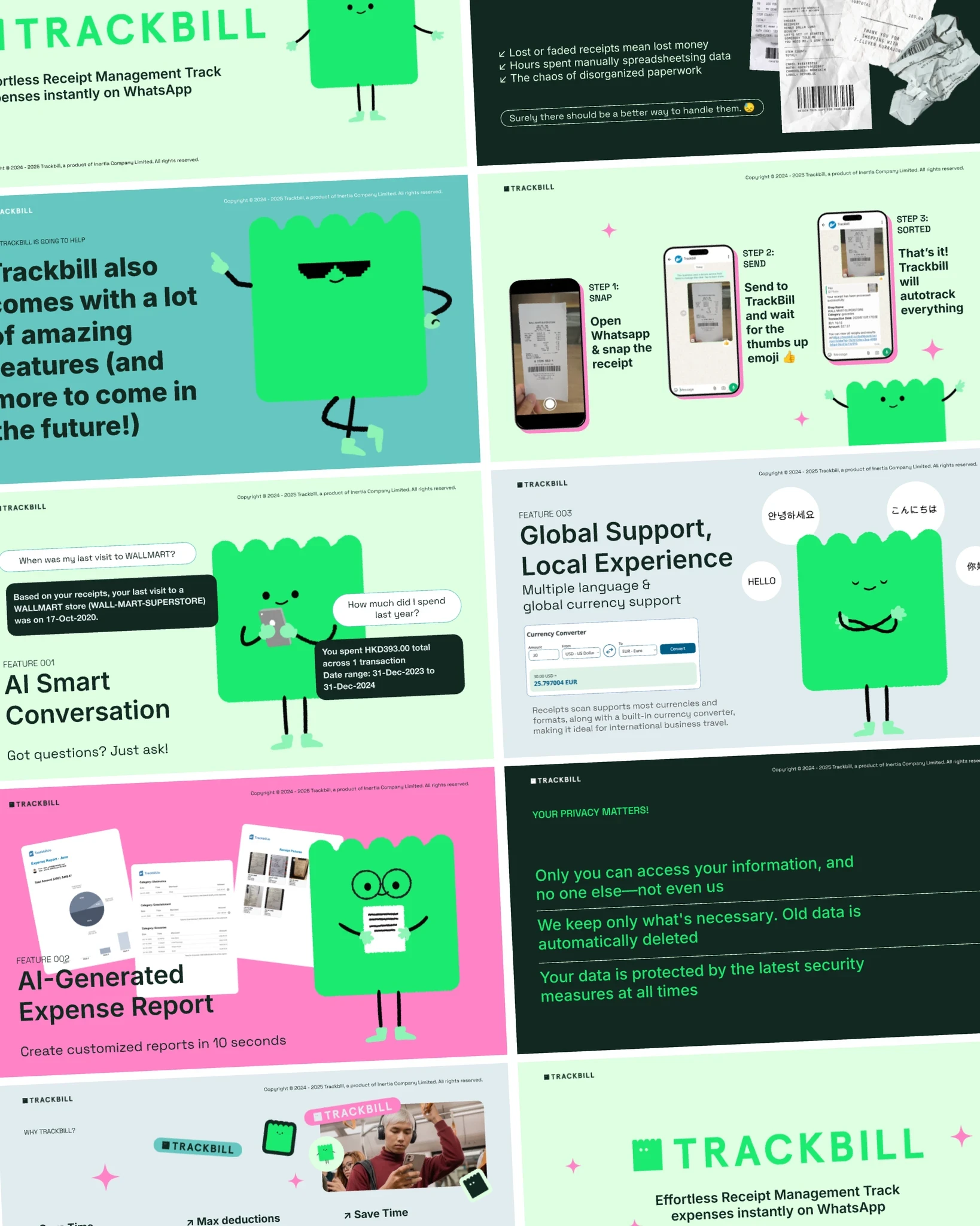 The centerpiece of the new identity is "Billie," a custom-designed mascot we created to serve as the user's "personal accountant." Billie gives a face to the AI, reinforcing the conversational nature of the product. The final brand package included the logo, color systems, and marketing visuals that illustrate specific use cases, showing users how they can simply ask Billie natural questions like "How much did I spend last week?" or "When did I last visit Walmart?"